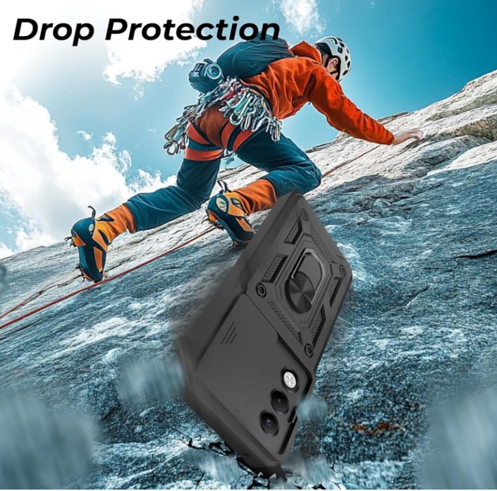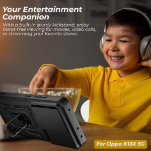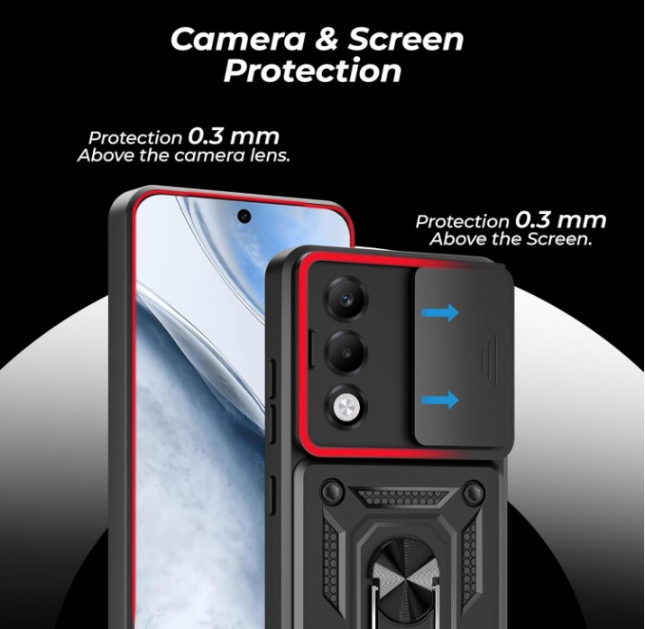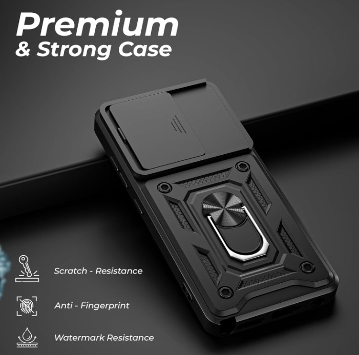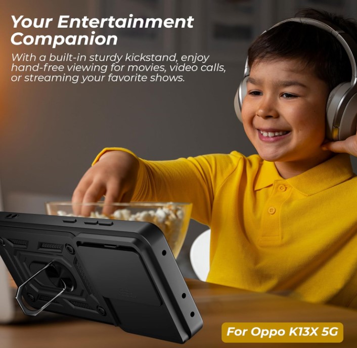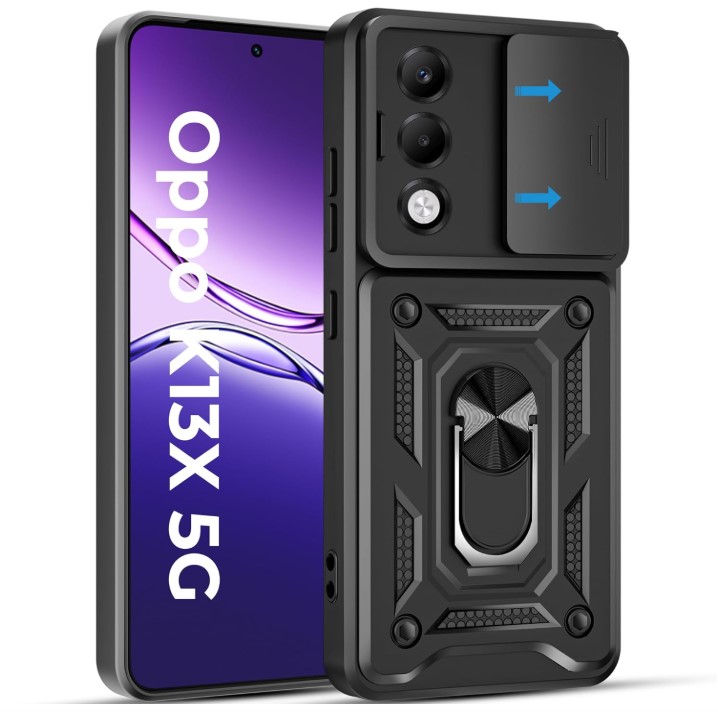 Protect your Oppo K13x 5G with this Armor Bumper Back Case, designed for maximum durability and style. Made with shockproof TPU material, it shields your phone from accidental drops and impacts. The case features a sliding camera cover for lens protection and a built-in ring holder stand that doubles as a secure grip and kickstand for hands-free use. With its rugged bumper design and sleek black finish, this case delivers both tough protection and modern style.