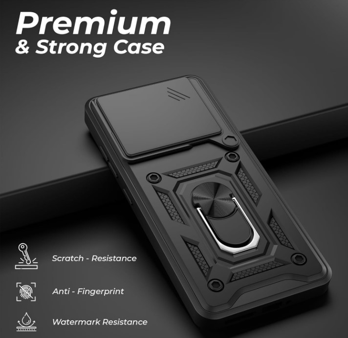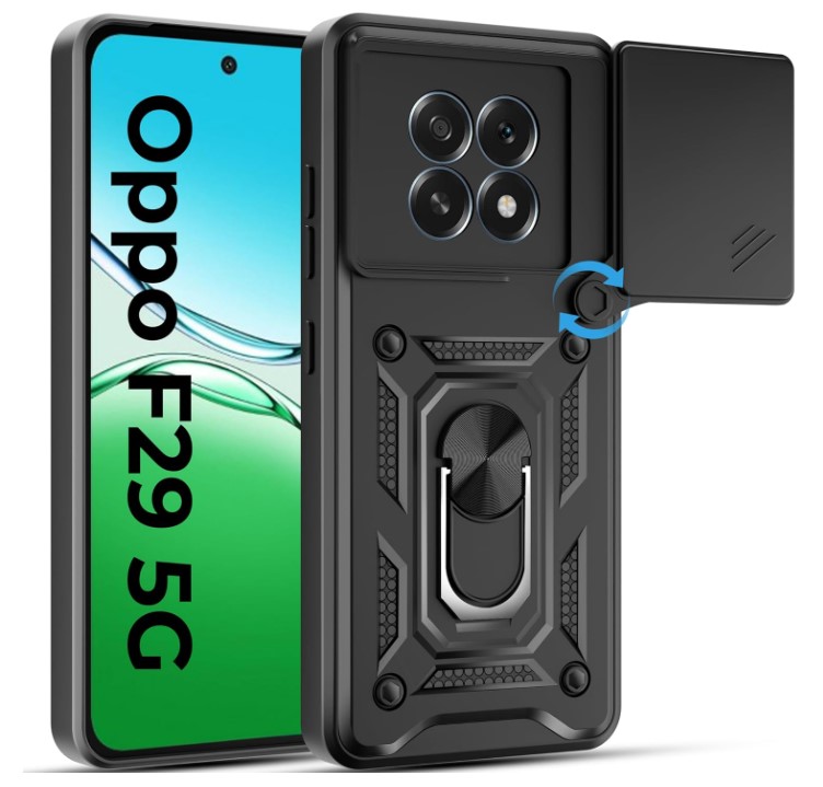 Protect your Oppo F29 5G in style with this premium black back cover. Crafted from durable shockproof TPU material, it offers reliable protection against drops and scratches. The innovative sliding camera cover ensures your lenses remain safe and dust-free, while the built-in stand and stylish ring holder add convenience and functionality. Sleek, modern, and practical, this back cover is the perfect blend of protection and style for your device.